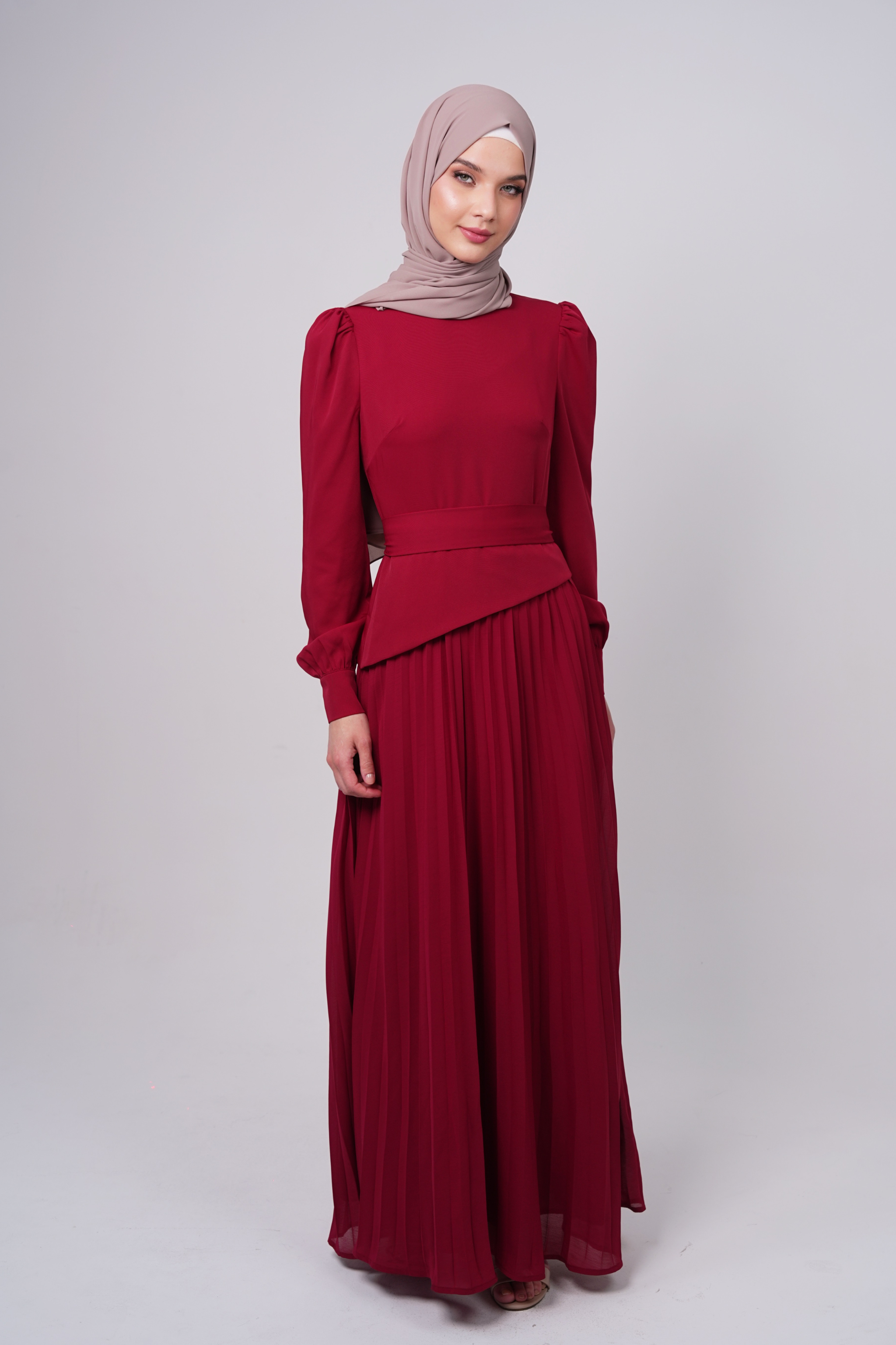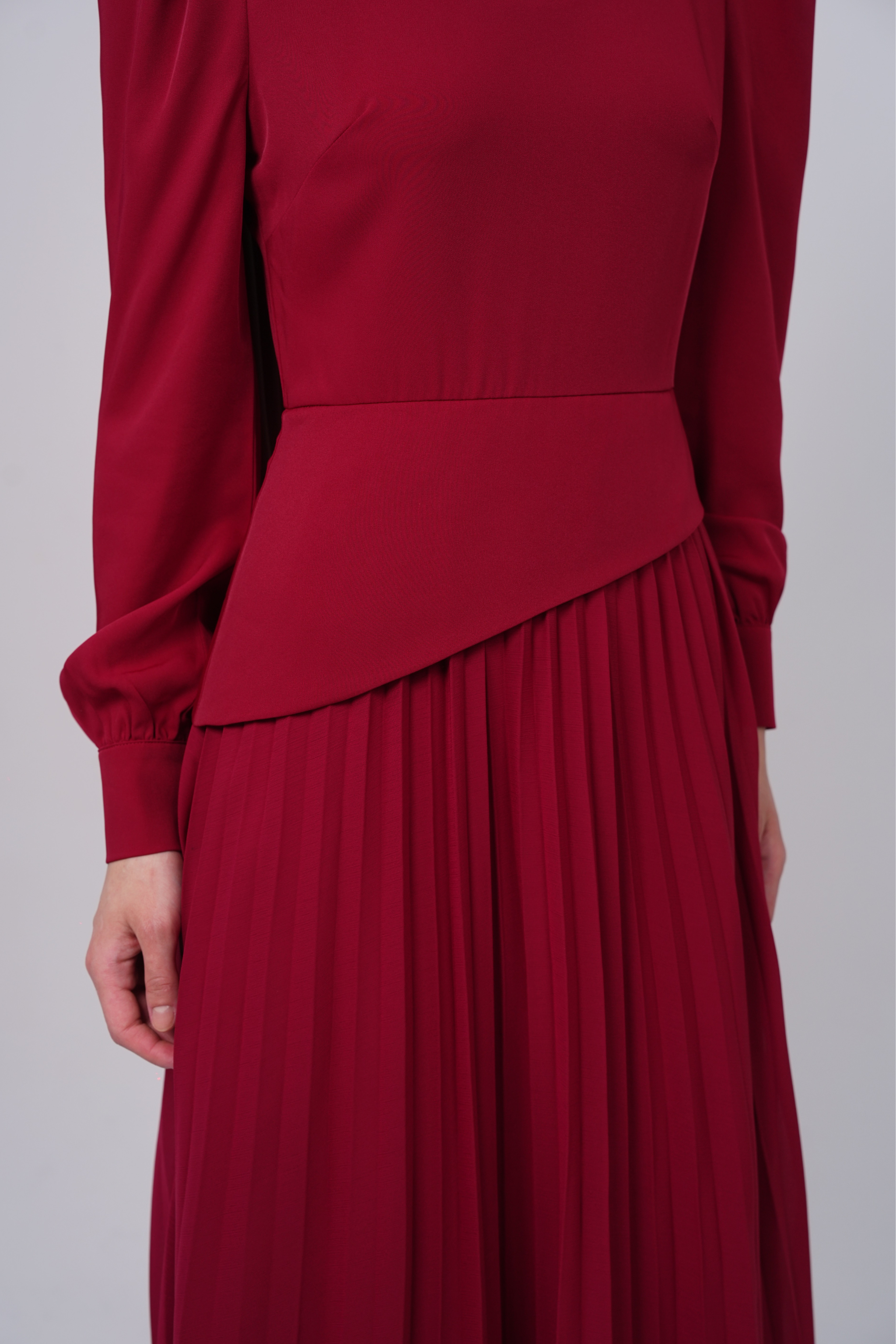 Elegant Crepe & Chiffon Maxi Dress – Dark Red