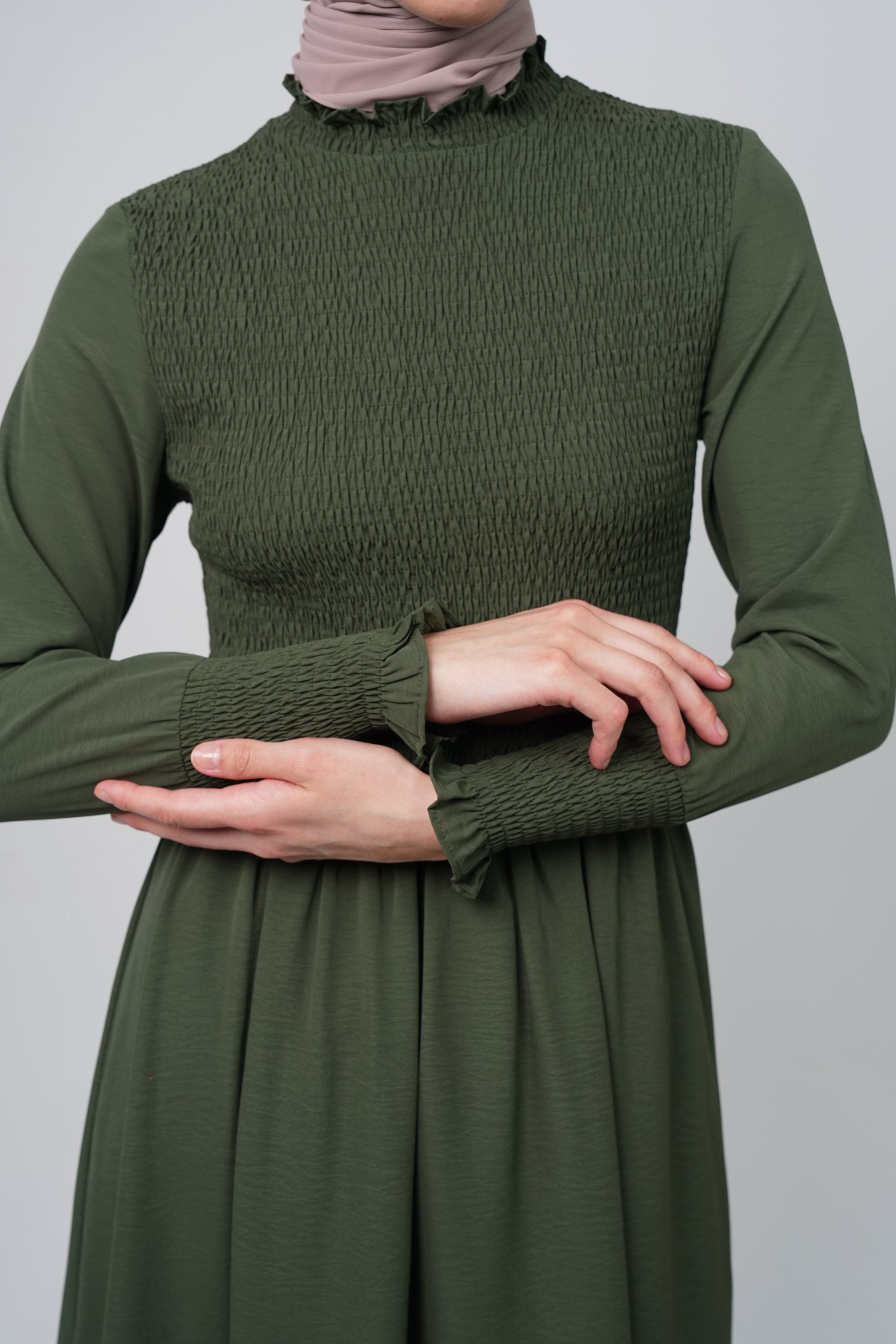 This Deep Forest Green Maxi Dress blends effortless sophistication with timeless modesty. Made from premium cold crepe fabric, it offers a lightweight yet structured drape, perfect for tall women. The fully smocked bodice and cuffs create a flattering, comfortable fit, while the high smocked neckline adds a touch of vintage charm.