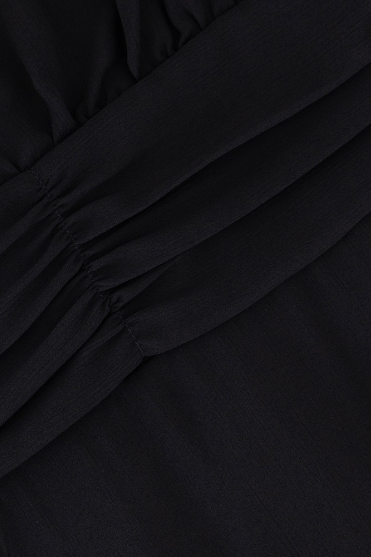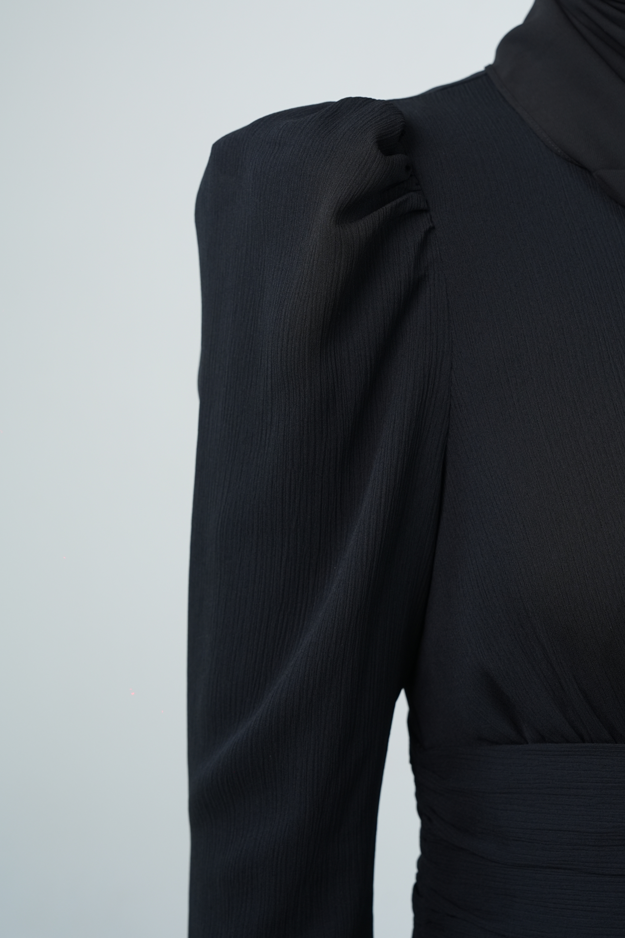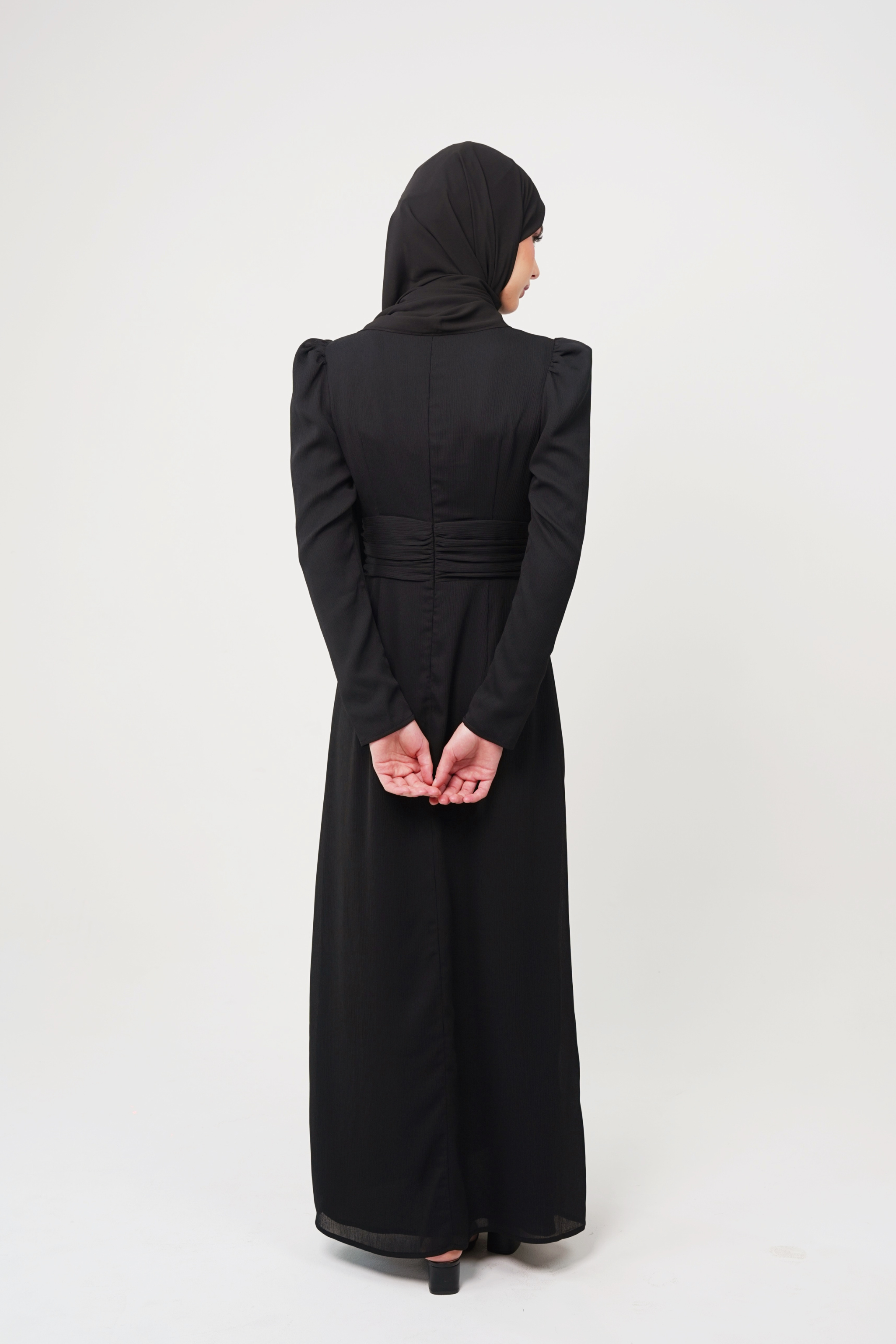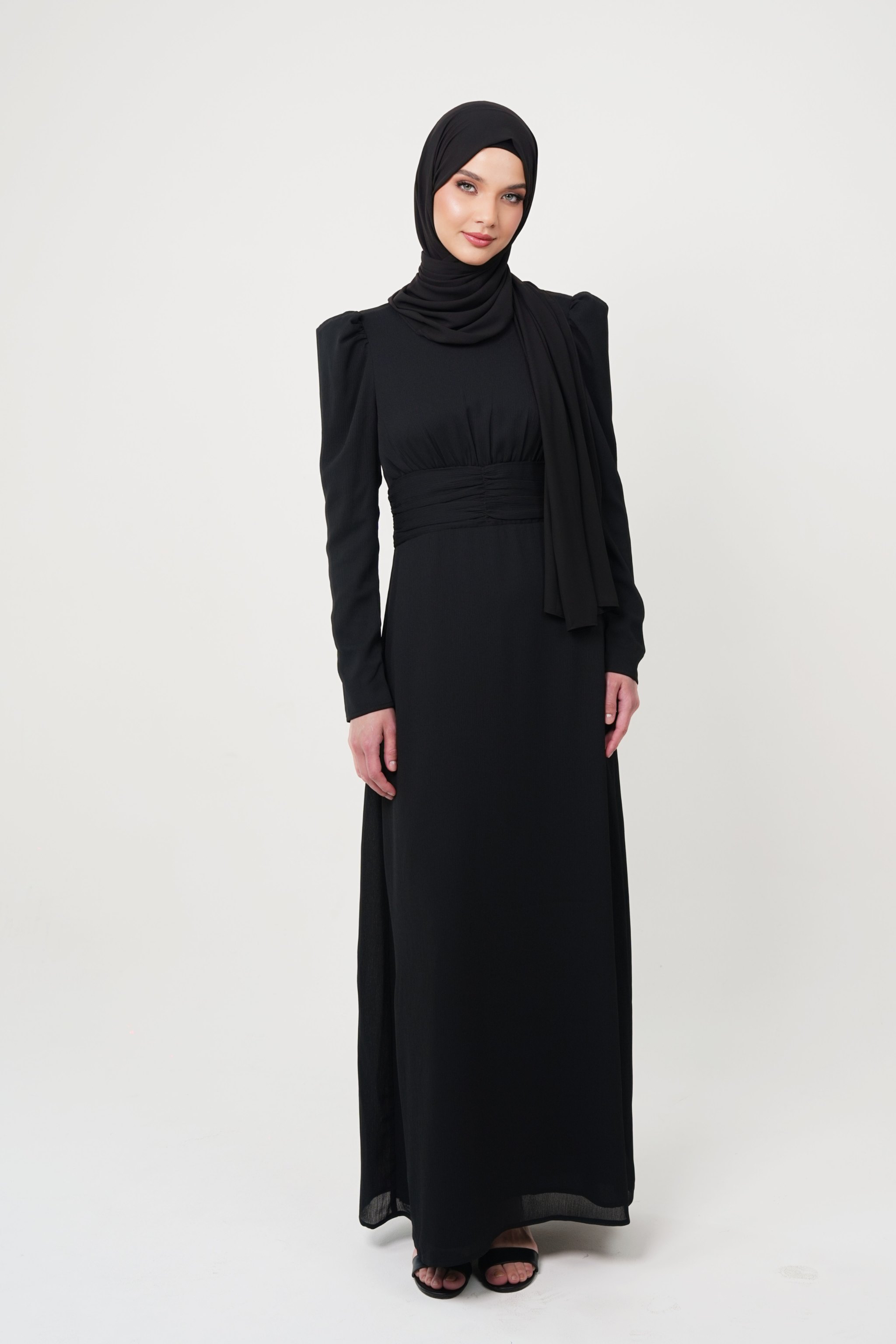 Maxi Dress with Ruched Waist and Puff Shoulders - Black