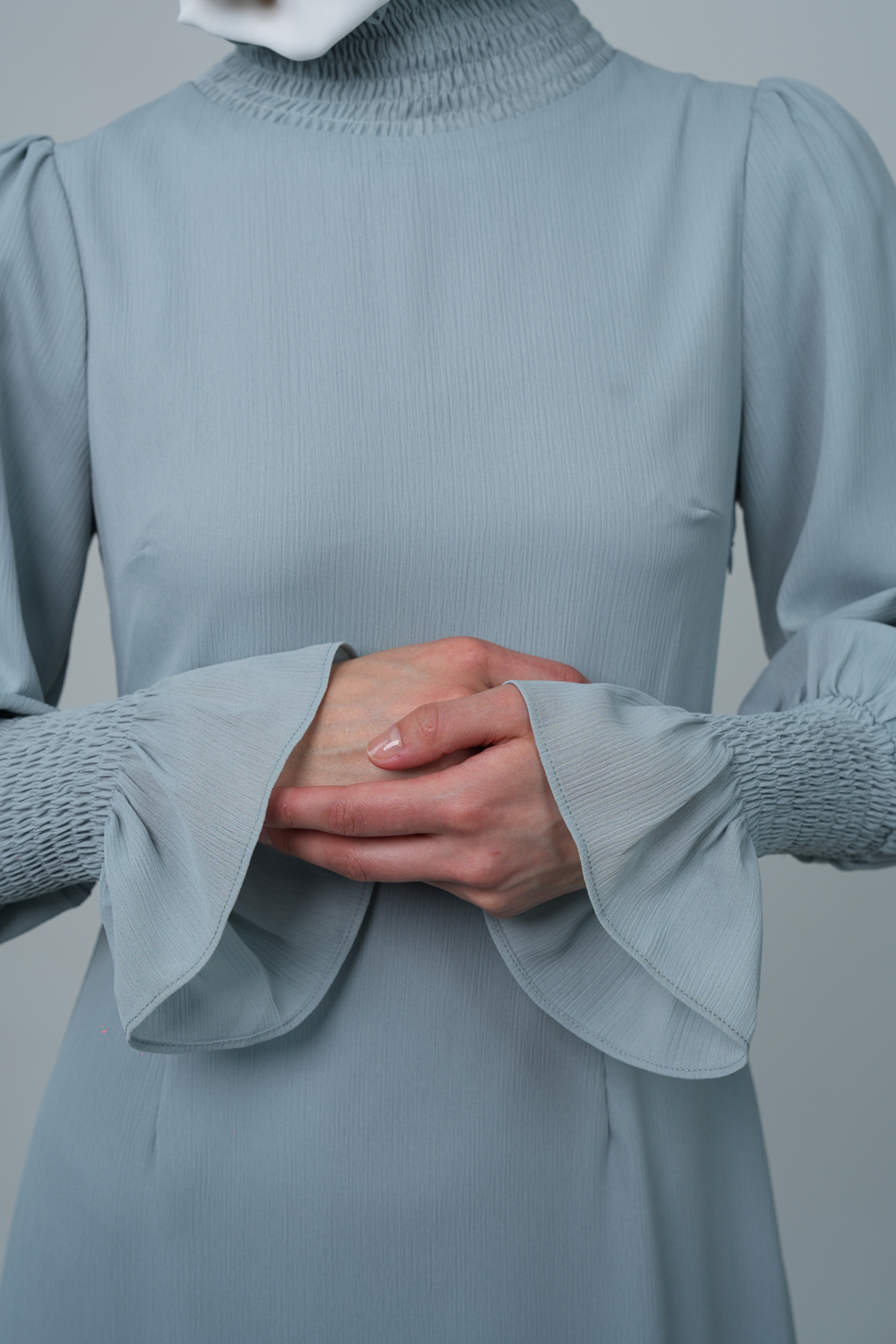 Maxi Dress with Smocked High Neck & Cuff Details - Slate Blue