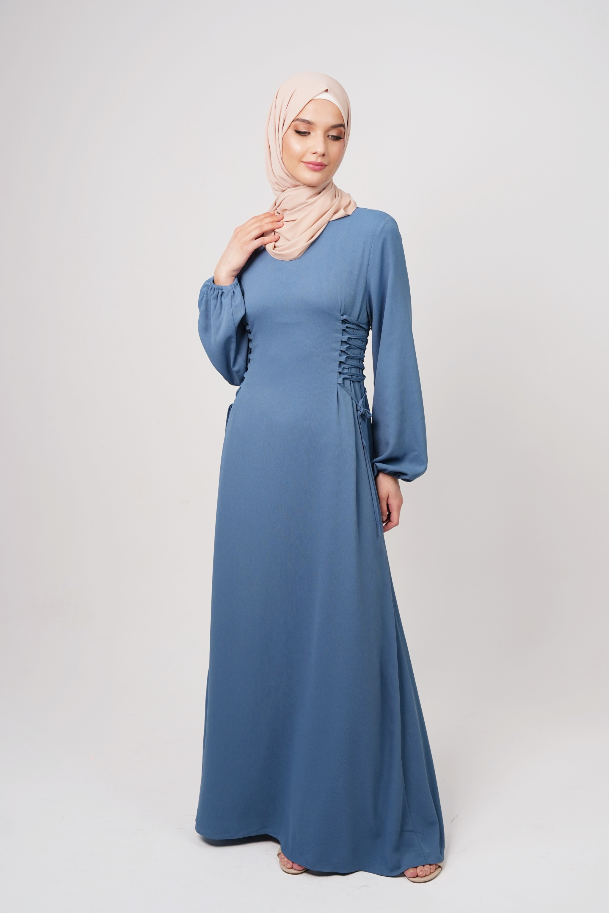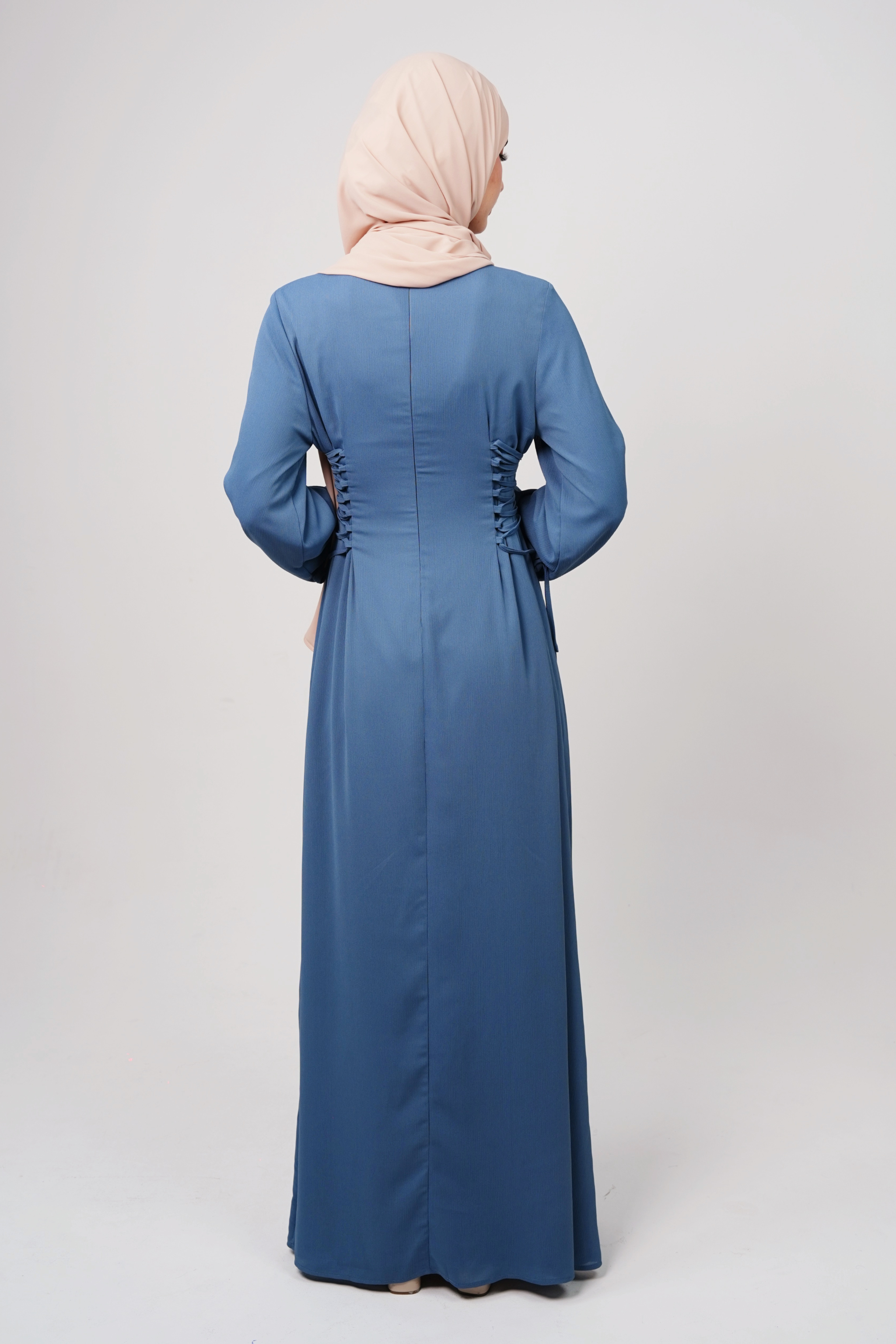 The adjustable side waist ties create a flattering shape while maintaining a relaxed fit. The long sleeves with gathered cuffs add a delicate, feminine touch. Fully lined for modesty and opacity, this dress is ideal for formal gatherings, evening wear, or elevated everyday looks. Its elongated cut makes it a perfect choice for tall women, ensuring a graceful, flattering drape.